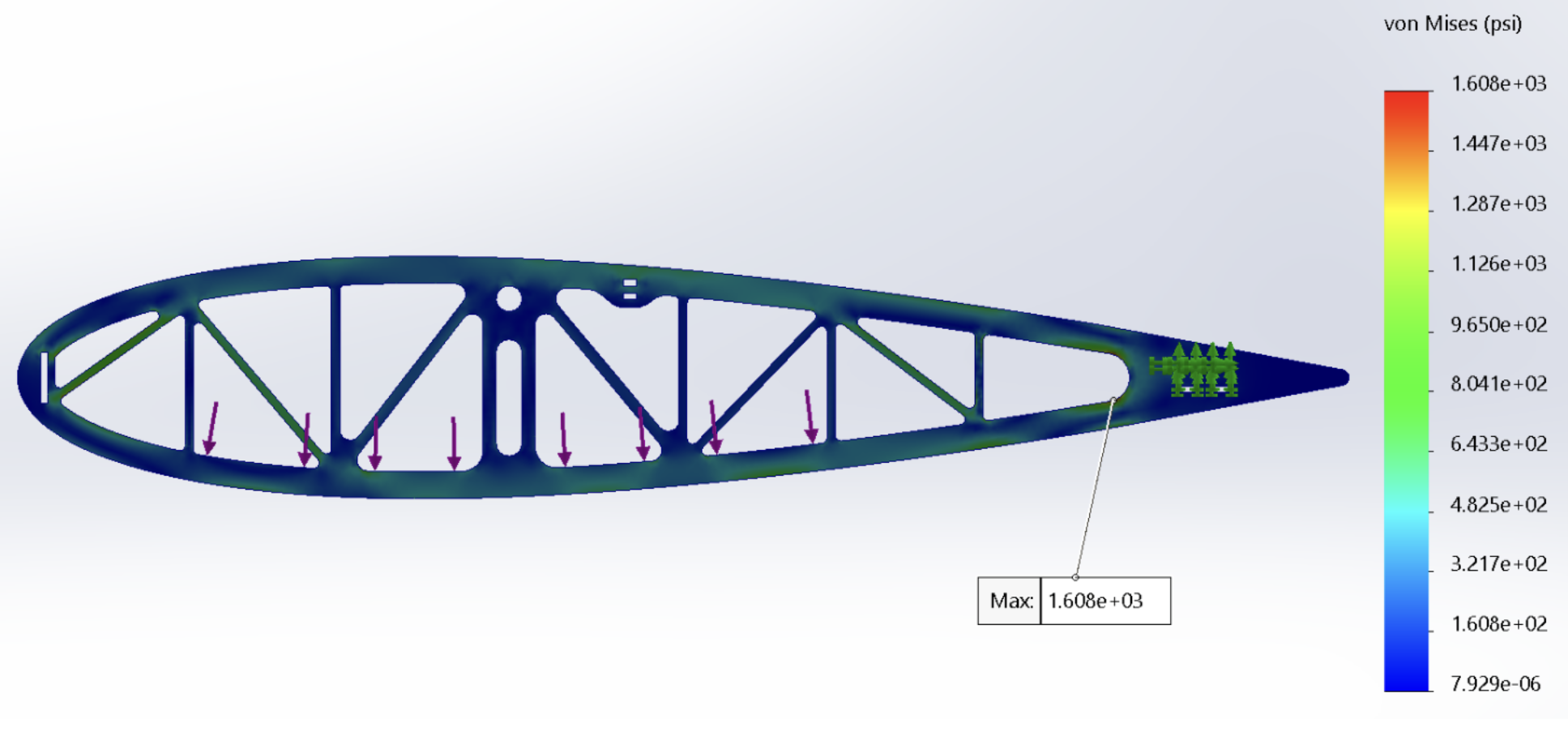 The fuselage’s main structural members were built of two longitudinal plywood ribs spanning the payload container’s width. Testing was done in FEA (SolidWorks) and physical tests were also performed to validate the analysis. Stiffeners were used to increase the stiffness along the lateral axis and mitigate twisting. Shear and bending analysis were also conducted to determine the optimal number, placement, size, and material of key stiffeners.