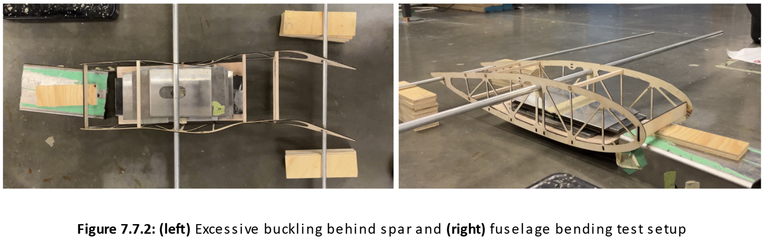 In FEA, I chose a larger-than-typical safety factor (2.8, normally ~1.2-1.4 for aircraft to reduce weight) to account for plywood’s anisotropic nature, unaccounted in simulation. To further validate the analysis, bending and torsional testing was done on a prototype fuselage.